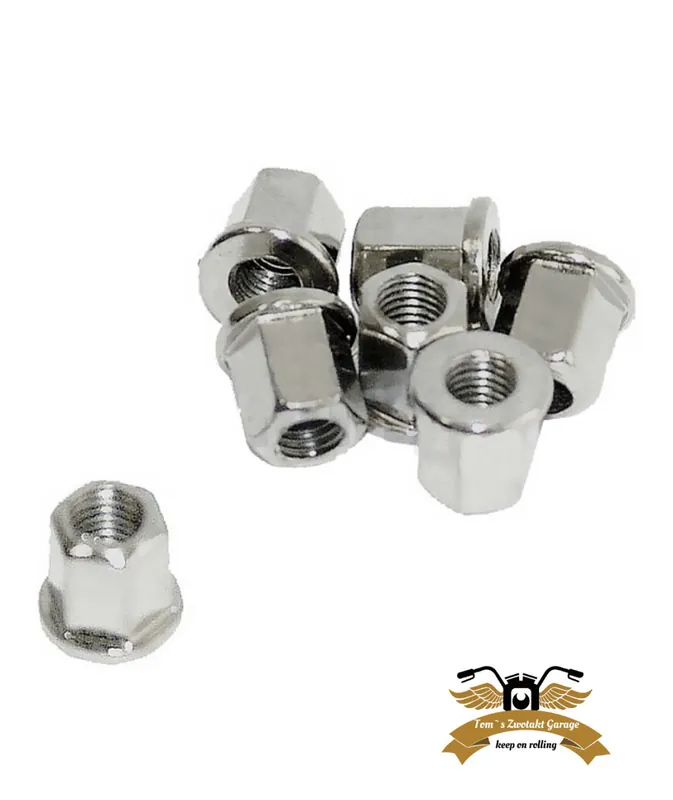 Die Muttern für die Stehbolzen sind erhöht mit einem Flansch. Die Stehbolzen Muttern bieten eine saubere Optik da sie auf Hochglanz poliert sind. Die Bundmuttern eigenen sich für diverse Mopeds und Mofas mit M7 Stehbolzen und überzeugen neben einer wertigen Optik mit sauberer Verarbeitung und sicherem Halt.